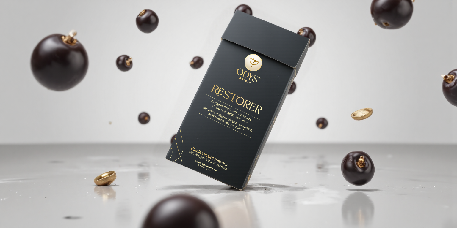 Formulated with only four essential ingredients — collagen tripeptide, hyaluronic acid, ceramide, and vitamin C — Odys Restorer supports your skin from within