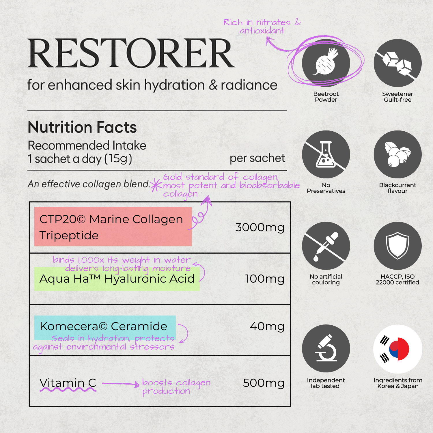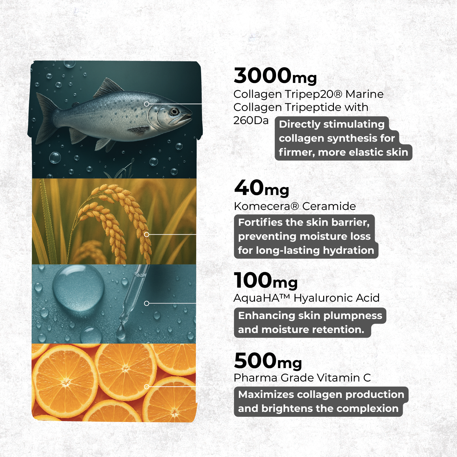 Odys Restorer uses Collagen Tripeptide (CTP20) stands out as the most advance form, ensuring maximum benefits for skin elasticity, hydration, reduce inflammation and overall health